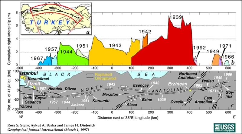 | Natural hazards Very severe earthquakes, especially in northern Turkey, along an arc extending from the Sea of Marmara to Lake Van. On August 17, 1999, a 7.4-magnitude earthquake struck northwestern Turkey, killing more than 17,000 and injuring 44,000. Environment Current issues Water pollution from dumping of chemicals and detergents; air pollution, particularly in urban areas; deforestation; concern for oil spills from increasing Bosporus ship traffic. |