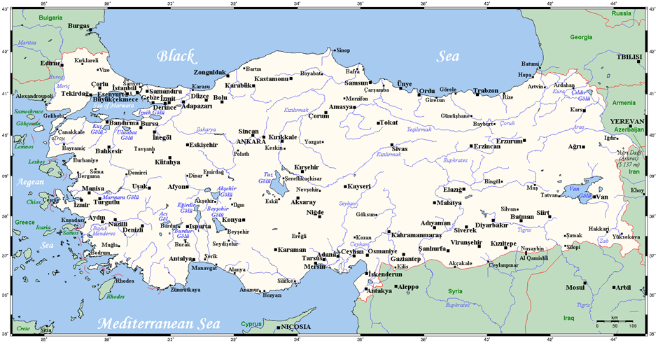 | East and Southeast Anatolia Main article: East Anatolia Region, Turkey Main article: South Eastern Anatolia Region, Turkey Eastern Anatolia, where the Pontus and Taurus mountain ranges converge, is rugged country with higher elevations, a more severe climate, and greater precipitation than are found on the Anatolian Plateau. The region is known as the Anti-Taurus, and the average elevation of its peaks exceeds 3,000 meters. Mount Ararat, at 5,137 meters the highest point in Turkey, is located in the Anti-Taurus. Many of the Anti-Taurus peaks apparently are recently extinct volcanoes, to judge from extensive lava flows. Turkey's largest lake, Lake Van, is situated in the mountains at an elevation of 1,546 meters. The headwaters of three major rivers arise in the Anti-Taurus: the east-flowing Aras, which empties into the Caspian Sea; the south-flowing Euphrates; and the south-flowing Tigris, which eventually joins the Euphrates in Iraq before emptying into the Persian Gulf. Several small streams that empty into the Black Sea or landlocked Lake Van also originate in these mountains. In addition to its rugged mountains, the area is known for severe winters with heavy snowfalls. The few valleys and plains in these mountains tend to be fertile and to support diverse agriculture. The main basin is the Mus Valley, west of Lake Van. Narrow valleys also lie at the foot of the lofty peaks along river corridors. Southeast Anatolia is south of the Anti-Taurus Mountains. It is a region of rolling hills and a broad plateau surface that extends into Syria. Elevations decrease gradually, from about 800 meters in the north to about 500 meters in the south. Traditionally, wheat and barley were the main crops of the region, but the inauguration of major new irrigation projects in the 1980s has led to greater agricultural diversity and development. |