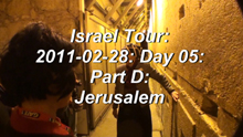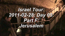 | View videos at YouTube: 2011-02-28: Israel Tour: Day 05: Jerusalem: Muslem Quarter, Dome of the Rock, Temple Mount, Western Wall Tunnels, Palace of Pontius Pilat where Jesus was scorged and started carrying the cross, Western Wall (Wailing Wall), Cardo (Heart of ancient Byzantine city), City of David, Hezekiah's Tunnel, Water System (Warren's Shaft), etc. |